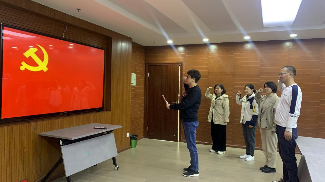 余萍同志领学了《中国共产党党徽党旗条例》,支部全体党员面向党旗重温入党誓词。