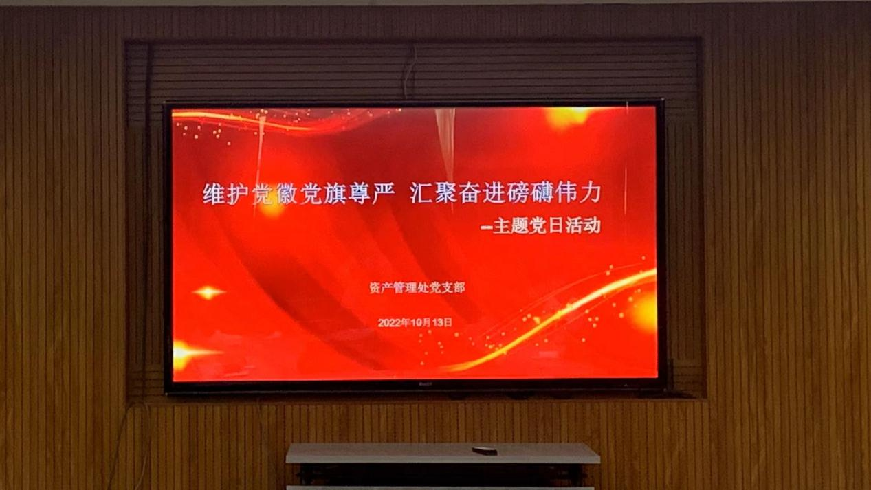 为进一步规范党徽党旗使用、管理,充分发挥党徽党旗的政治功能,增强支部的凝聚力、战斗力,激发党员党的意识,激励党员不忘初心,牢记使命,坚定理想信念,汲取奋进力量,喜迎党的二十大胜利召开,2022年10月13日资产管理处党支部在行政楼7楼会议室开展了“维护党徽党旗尊严,汇聚奋进磅礴伟力”主题党日活动。