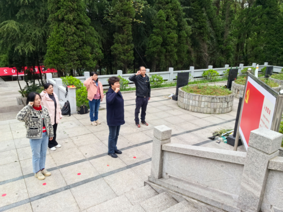 随后全体同志前往白云烈士陵园进行悼念和祭扫活动,苍松翠柏,庄严肃穆,全体同志在烈士纪念碑前怀着崇高的敬意向英雄鞠躬默哀,并依次向革命先烈敬献鲜花,表达对革命烈士的缅怀和追思。余萍同志带领全体党员面对烈士纪念碑进行党员宣誓,铿锵有力的声音,展示了党员们不忘初心、牢记使命的诺言和决心。